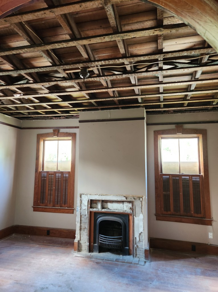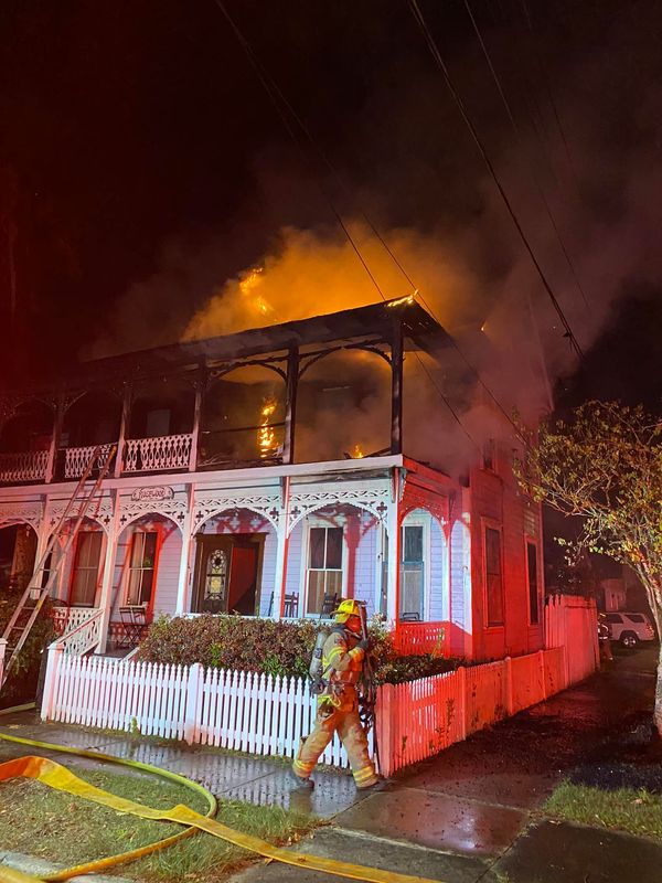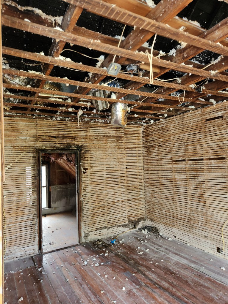 The flames went through the upstairs ceiling and scorched the underside of the roof